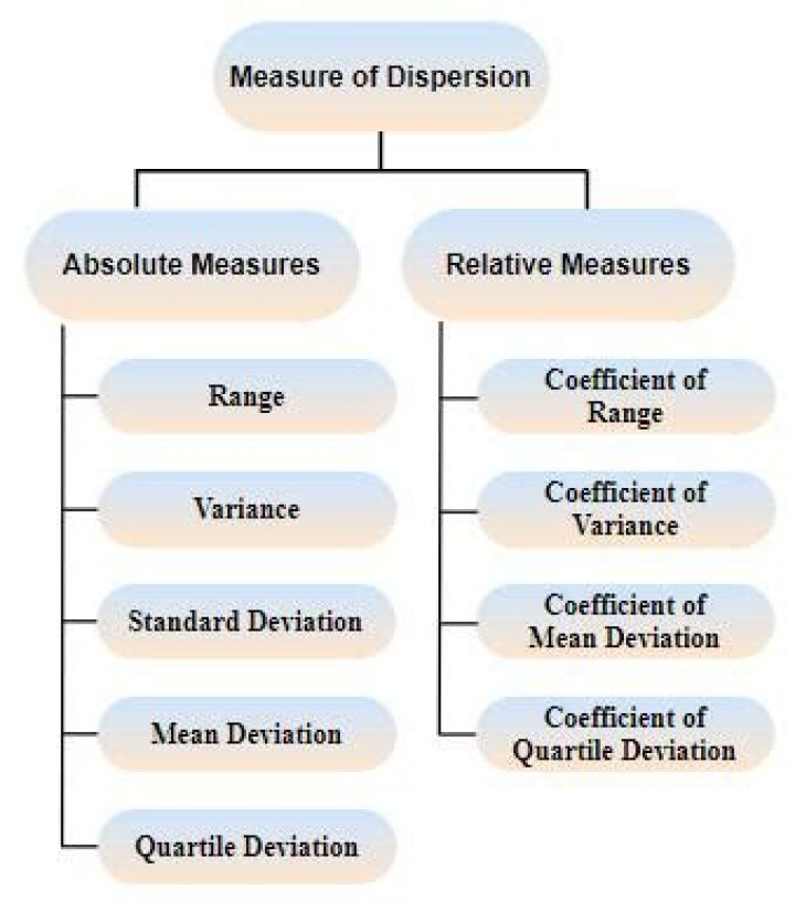 Absolute measures include Range, quartile deviation, mean deviation, and standard deviation. Relative measures include coefficients of range, quartile deviation, variation, and mean deviation. Hence, Quartile is not the measure of dispersion.
