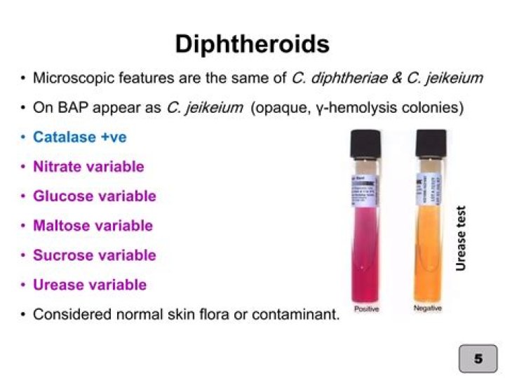 All species are catalase positive. All species are oxidase negative except for Corynebacterium bovis, Corynebacterium aurimucosum, Corynebacterium doosanense, and Corynebacterium maris (below).