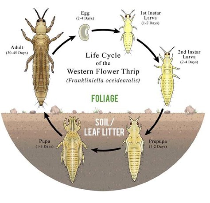 Adults and pupae thrips overwinter in the soil. In spring, females insert eggs into the tissues of flowers, leaves or stems—each female can produce up to 80 eggs. … They then go through to or more nymphal stages before becoming adults.