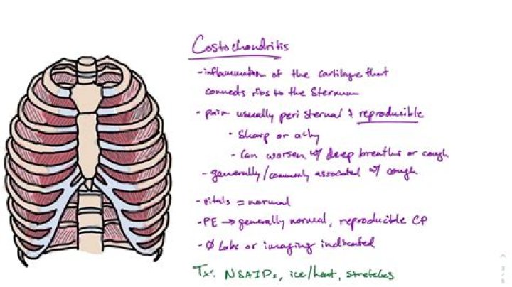 The pain from costochondritis may be most noticeable when an individual is lying in bed at night. It is important to find a suitable lying position in order to reduce the degree of discomfort. It may be useful to use local heat as much as possible providing this does not aggravate the condition.