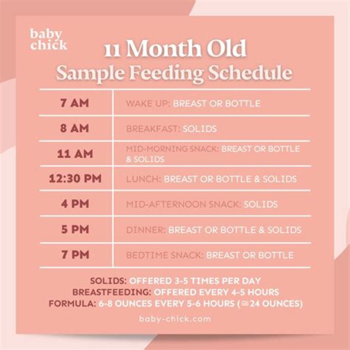 A good feeding schedule for a 10-month-old should include at least 3–4 nursing sessions or bottles per day. A 10-month-old baby should be drinking at least 24–32 ounces of breast milk or formula every 24 hours.