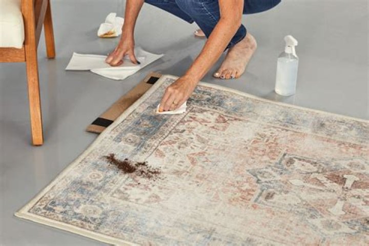 Combine 2/3 cup of cool distilled water and 1/3 cup of white distilled vinegar in a spray bottle. Spray the affected area and blot with a white paper towel or cloth without rubbing or scrubbing the spot. Continue patting the area until the stain has thoroughly been lifted from the rug.