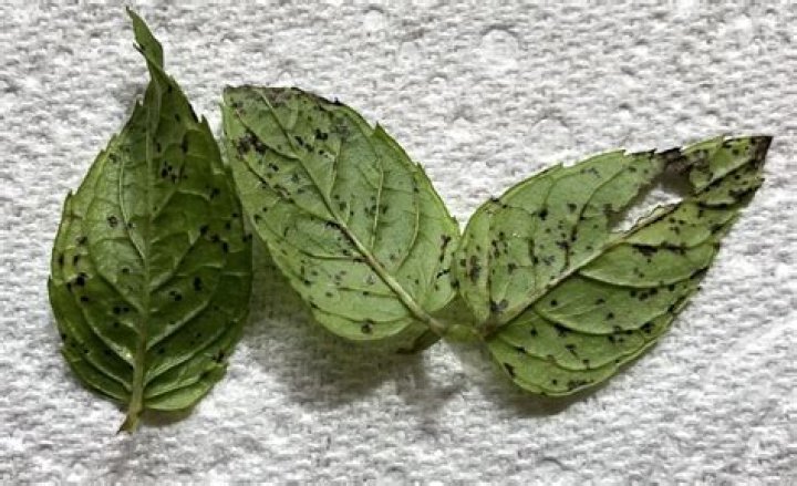 In late summer, mint rust appears yellow and by fall, the mint plants can have black spots on the leaves. The spots are caused by the fungal spores of the mint rust fungus (Puccinia menthae). It can cause the leaves to die and fall off of the mint plant, and it can spread to other mint plants in the area.