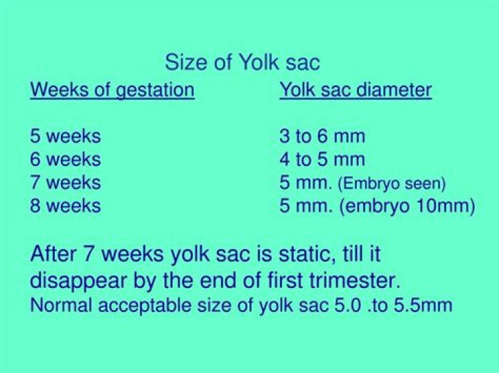 Weeks of gestationYolk sac diameter5 weeks3 to 6 mm6 weeks4 to 5 mm7 weeks5 mm. (Embryo)8 weeks5 mm. (Embryo)