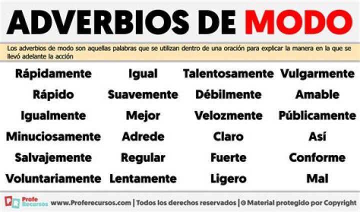 Adverbios de modo: bien, mal, regular, despacio, deprisa, así, tal, como, aprisa, adrede, peor, mejor, fielmente, estupendamente, fácilmente, negativamente, responsablemente, rápidamente —todas las que se formen con las terminaciones «mente»—.