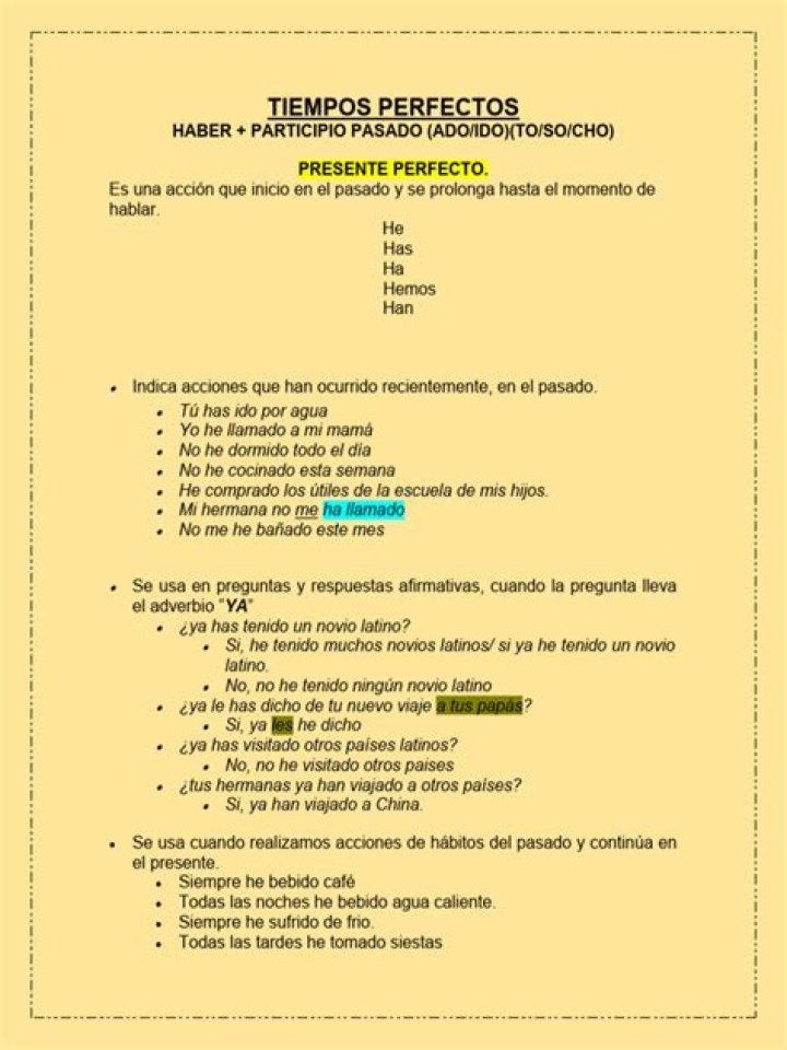 PersonaVerbo auxiliarParticipioyohehablado aprendido vividotúhasél/ella/Ustedhanosotros/-ashemos