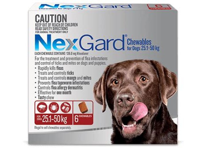 NexGard is given as a tablet of the appropriate strength for the dog’s bodyweight. NexGard kills fleas within 8 hours and ticks within 48 hours. After being given, its actions last for at least 5 weeks against fleas and up to one month against ticks.