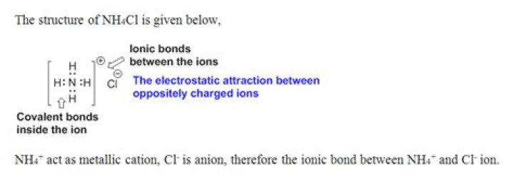 NH4Cl is an inorganic compound with the chemical name Ammonium Chloride. … Ammonium chloride helps maintain pH and exerts a mild diuretic effect. In the NH4Cl molecule, an ionic bond is formed between NH4+ and Cl– ions. 3 covalent bonds are formed between N and three H atoms.