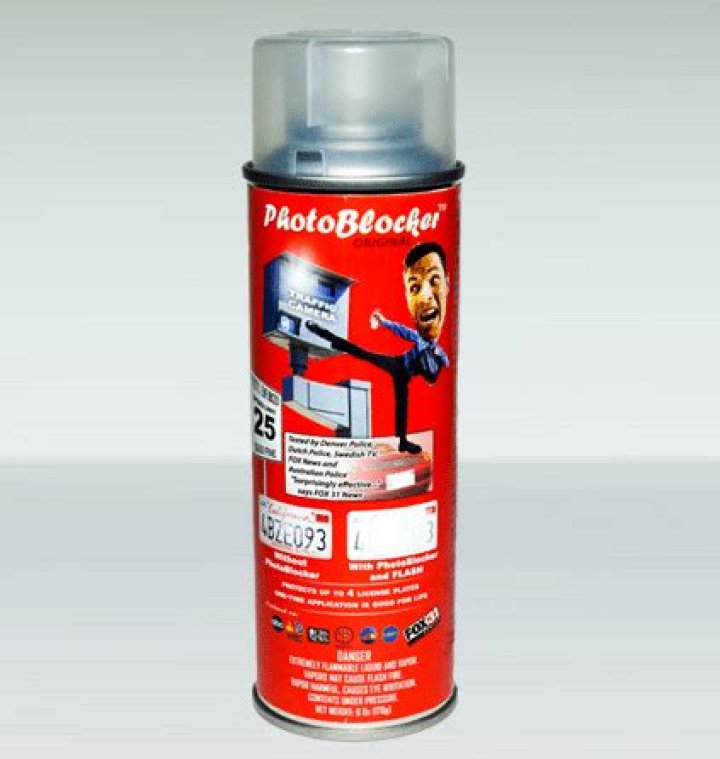 PhotoBlocker is a clear spray that its maker claims will make the plate so reflective, a red light camera will be blinded by its own flash. Suggested retail price is $49.95. We tested PhotoBlocker along with an armload of other products that similarly claim to make a car invulnerable to red light and speed cameras.