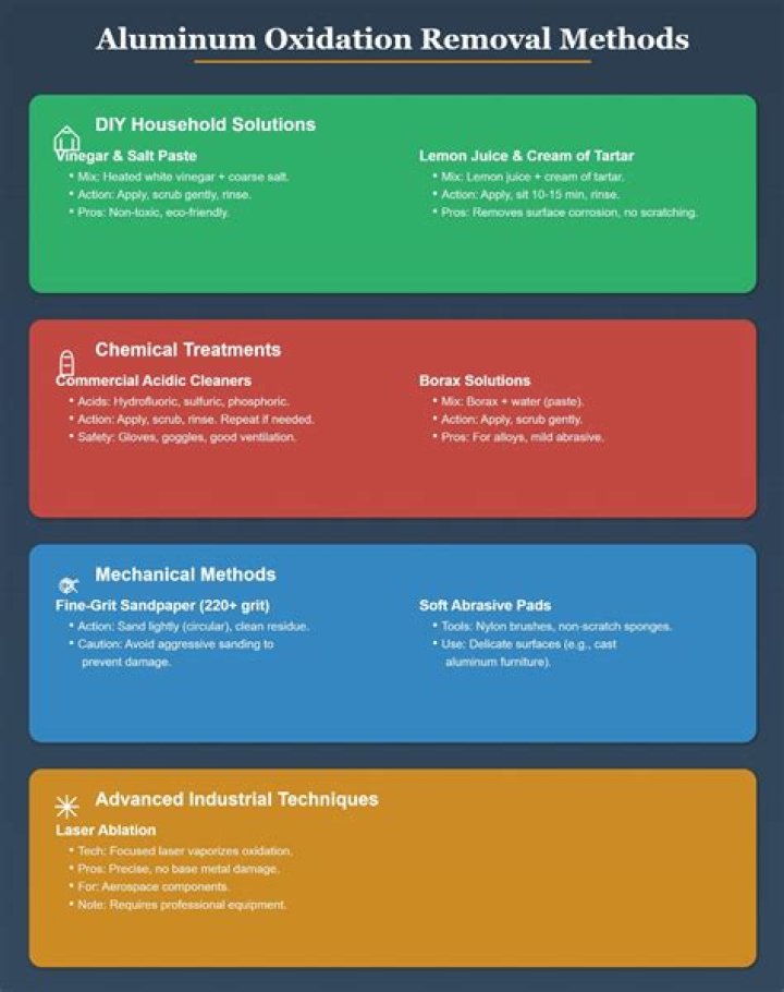 Using a DIY Solution to Clean Oxidized Aluminum Mix 1 tablespoon white vinegar with 2 cups of warm water in a bucket or use this ratio to make a larger amount, depending on what you are cleaning. Wet a cloth or non-abrasive pad in the vinegar-water mixture and then use it to clean the aluminum surface gently.