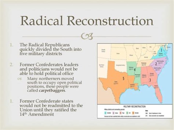 Radical Reconstruction included a Reconstruction Act that “threw out state governments that had refused to ratify the Fourteenth Amendment.” It used the Military Reconstruction Act to divide the southern states into five military districts and gave military rulers “nearly unlimited power” to enforce laws the way they …