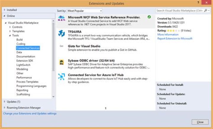 - Search for ‘Visual Studio WCF Connected Service’ and install.