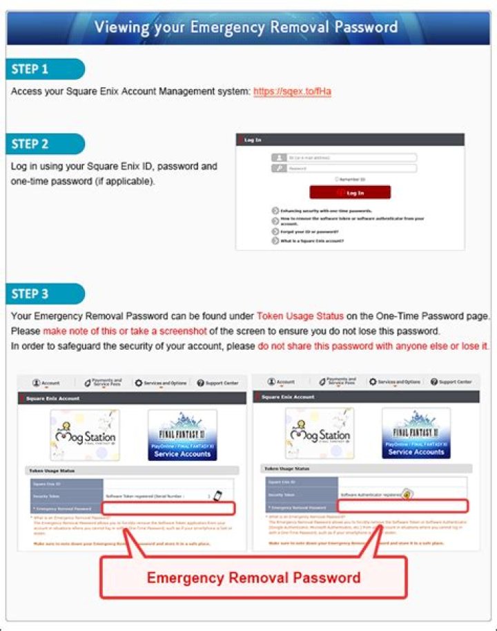 (1) Log in to the Square Enix Account Management System. (2) After you have logged into the Square Enix Account Management System, your Emergency Removal Password will be displayed under “Token Usage Status” below the “Square Enix Account Information” section at the right side of the screen.