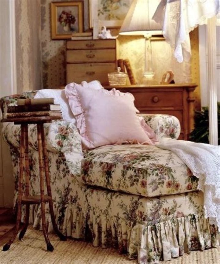 A home decorated in English cottage style is one where sofas are made to be sprawled out on, favorite books and keepsakes are always close at hand, and signs of wear proudly speak to a lifetime of happy use. … The pale-blue floral wallpaper sets a quiet mood in this cottage-style bedroom.