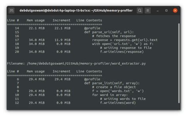 You can use it by putting the @profile decorator around any function or method and running python -m memory_profiler myscript. You’ll see line-by-line memory usage once your script exits.