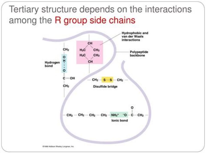 R group interactions that contribute to tertiary structure include hydrogen bonding, ionic bonding, dipole-dipole interactions, and London dispersion forces – basically, the whole gamut of non-covalent bonds.