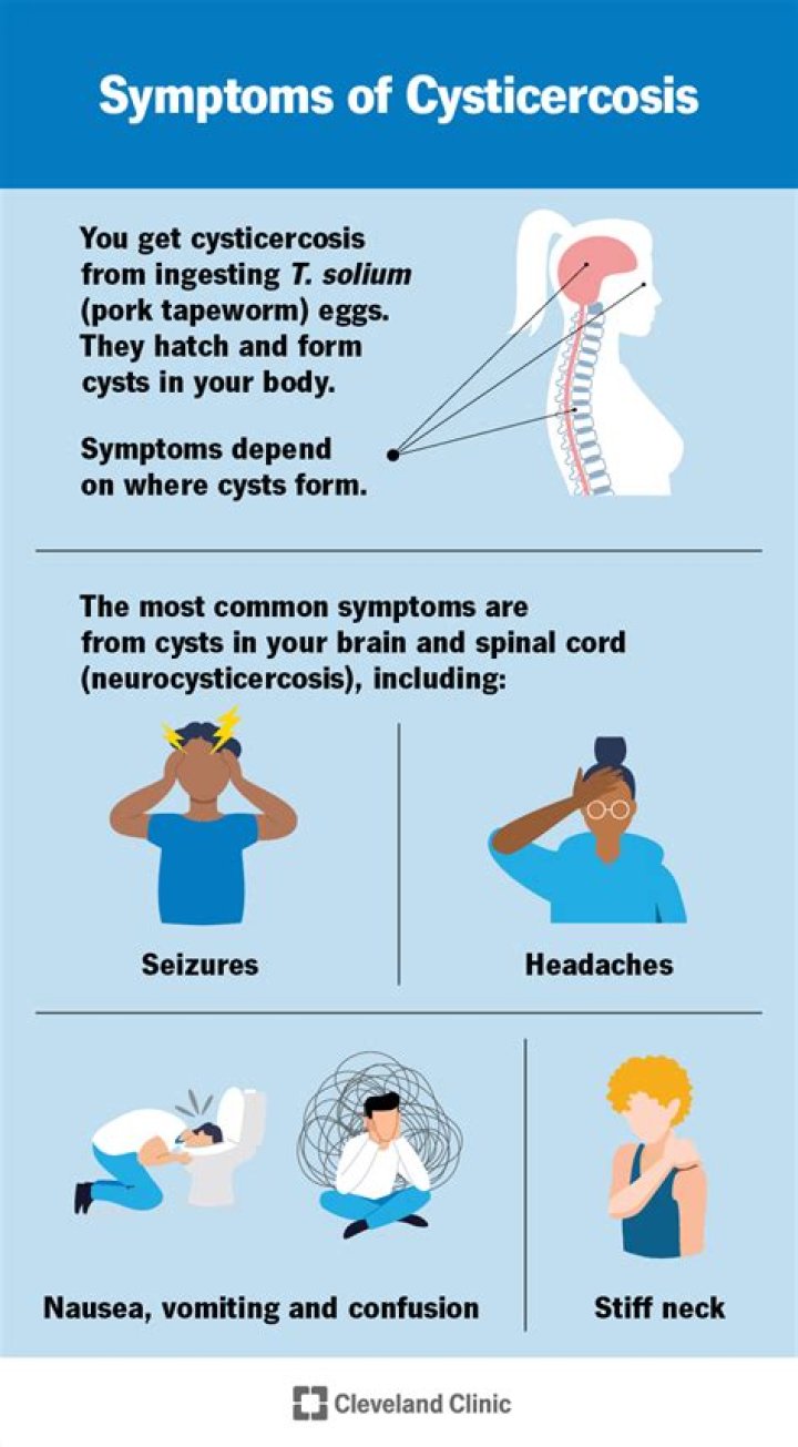Signs and symptoms will depend on the location and number of cysts in your body. Cysts in the muscles: Cysts in the muscles generally do not cause symptoms. However, you may be able to feel lumps under your skin.What is the incubation period for cysticercosis?