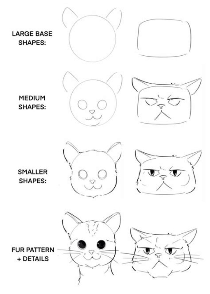 Here’s how. STEP 1: Draw a small circle for the cat’s head. Then add a larger circle below it and a larger one still below that for the cat’s body. STEP 2: Join the circles together with a smooth, curving line to draw the cat’s neck and back on the right-hand side and another on the left for the cat’s neck.