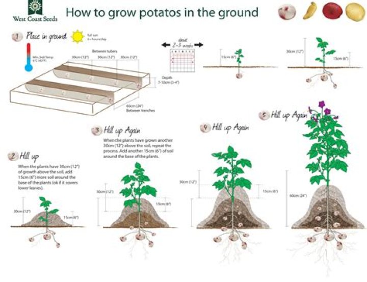 Dig straight, shallow trenches, 2 to 3 feet apart, in prepared soil. Plant seed potatoes 12 inches apart and cover with about 3 inches of soil. When the shoots reach 10 to 12 inches tall, use a hoe or shovel to scoop soil from between rows and mound it against the plants, burying the stems halfway.How long does it take for potatoes to grow after planting?