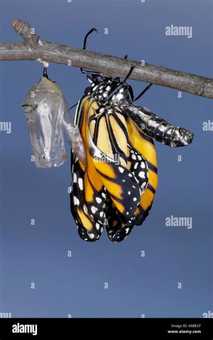 When the butterfly first hatches, its wings are soft and malleable. The butterfly needs to hang vertically so its wings can take shape and firm up. After about two hours, the butterfly’s wings have dropped completely and are fully formed, ready for first flight.