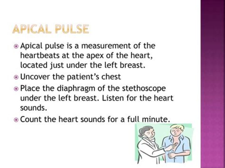 Apical pulse measurements usually take place while a person is either sitting or lying down. The doctor will place a stethoscope on the left side of the breastbone, over the apex of the heart. They can also feel the apical pulse at the point of maximal impulse (PMI).