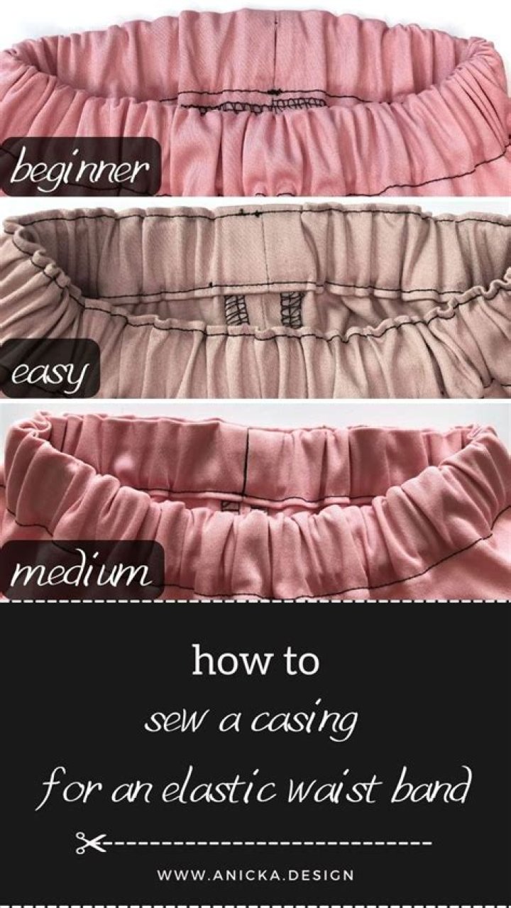 The casing is the “tunnel” that holds elastic in the sewn garment, whereas cut-on waistbands are folded down and topstitched from the right side. … You can also forgo the top stitching and stitch the elastic directly to the edge of your pants, then turn it inside and secure it in the side seams for an invisible look.