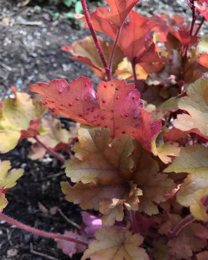Small brown spots, sunken depressions or raised bumps on the upper leaf surface. Raised, orange to brown spore-producing pustules on the corresponding underside. The pustules may turn a greyish-white colour under humid conditions. Pustules may also sometimes be produced on the upper surface.Why does my Heuchera have brown spots?