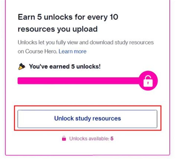 You can earn Course Hero Unlocks for free by uploading your original study materials and documents to help others learn. When you upload your material, you’ll receive 5 Unlocks for every 10 successful uploads. Any Unlocks you earn are good for 30 days and can be used to view and download full Course Hero documents.