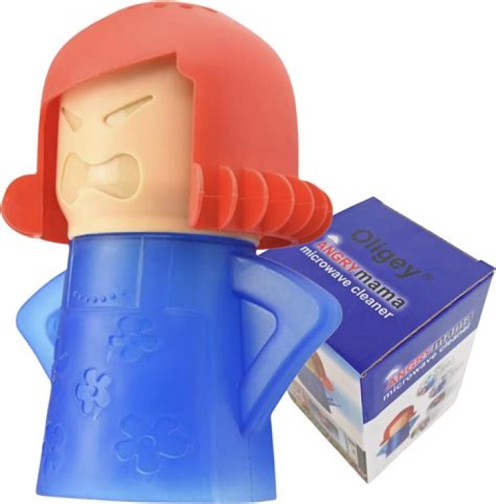 The Angry Mama Microwave Cleaner uses water and vinegar to soften chunks of food sticking to the inside walls of your microwave. Fill the furious woman with water and vinegar, set your microwave timer to seven minutes, and watch steam rise from her head.