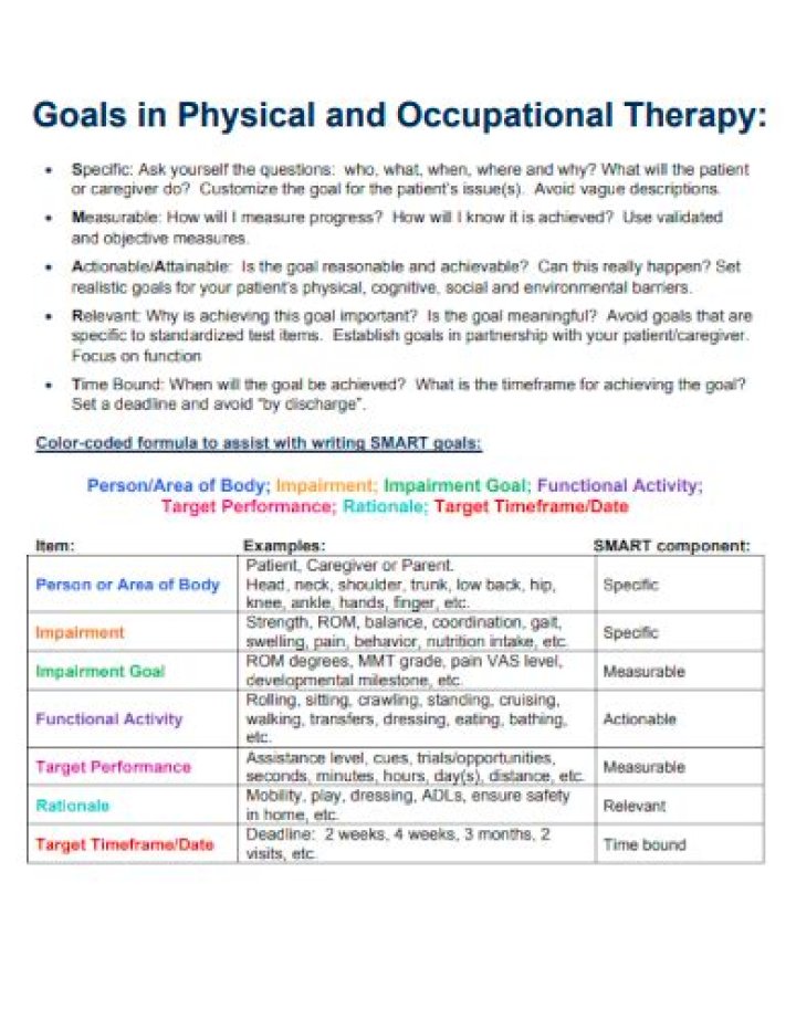 A SMART goal is an acronym for a goal that consists of five different essential factors: Specific; measurable; attainable; relevant; and time-based. This is a great tool for occupational therapists and other health professionals when composing goals and checking that each goal contains all of the essential components.How do you write a smart goal statement?