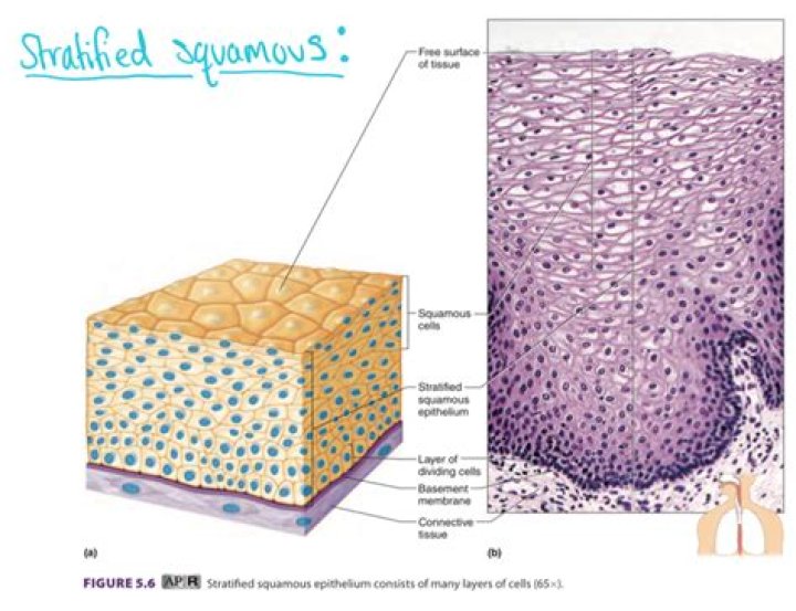 Stratified squamous epithelium comprises layers of flat-shaped, scale-like epithelial cells. It is different from the type observed in the esophagus in that, unlike other squamous epithelium, that observed in the esophagus does not have keratinized cells, i.e., it lacks a stratum corneum.
