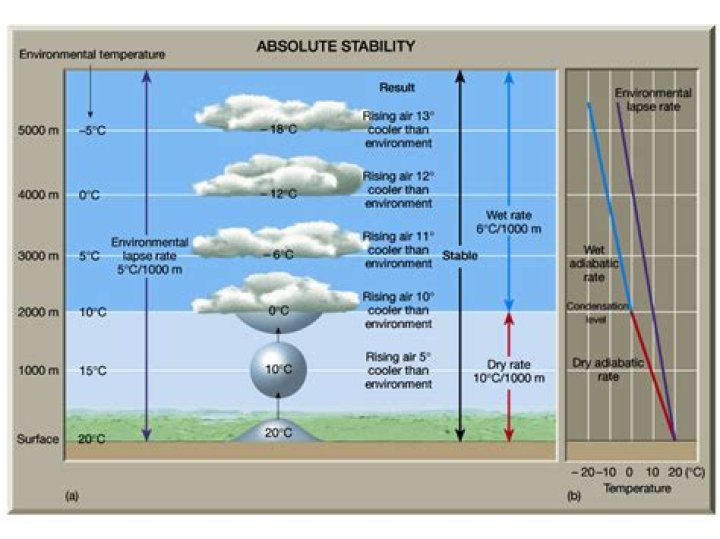 The atmosphere is considered to be stable if a rising parcel cools faster than the environmental lapse rate. This causes the air parcel to be cooler and more dense than its surroundings and, therefore, lose its buoyancy. Vertical motions tend to be restricted when the atmosphere is in stable equilibrium.