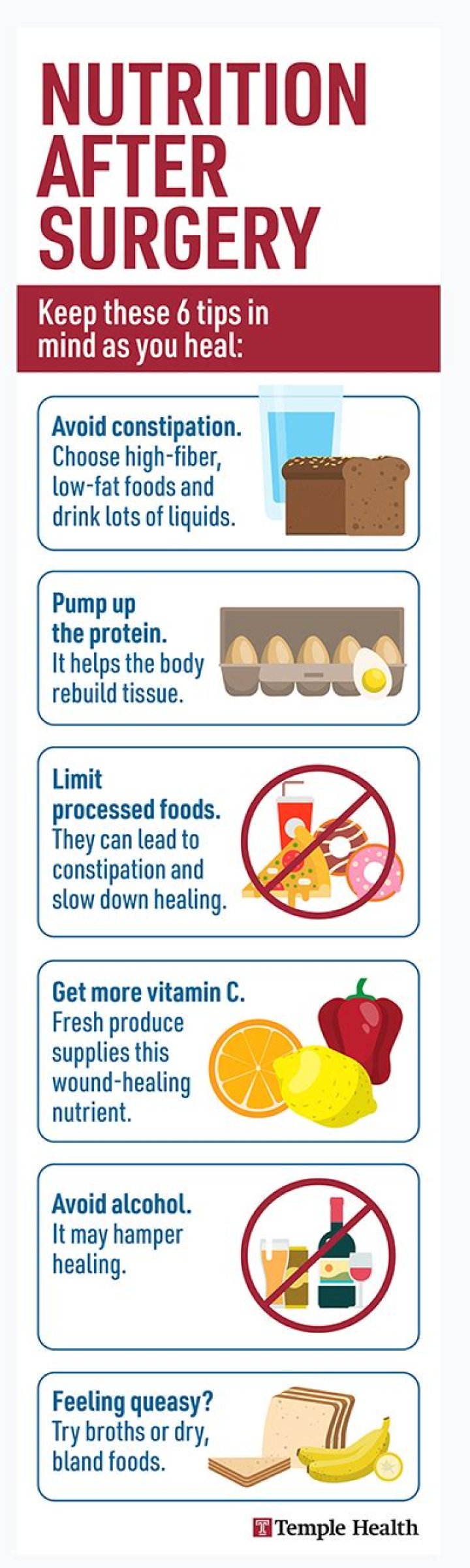 A healthy, nutrient-rich diet is not only important before surgery, but also after surgery to help your body heal. After surgery, you actually need to consume more calories, because your body requires energy to heal.