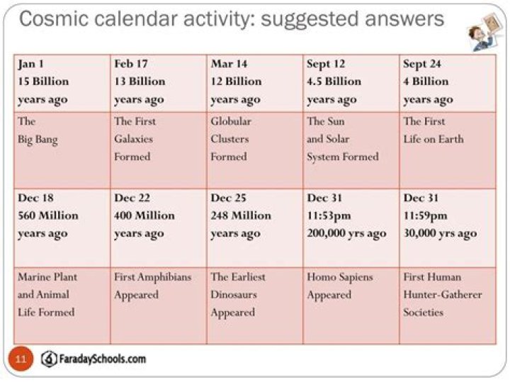 The Cosmic Calendar is a method to visualize the chronology of the universe, scaling its currently understood age of 13.8 billion years to a single year in order to help intuit it for pedagogical purposes in science education or popular science.Is the Cosmic Calendar accurate?