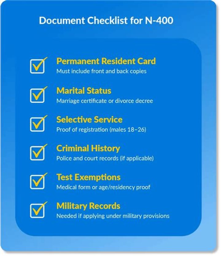 In addition to the completed Form N-400, you must also submit the following documents as supporting evidence with your Application for Naturalization: Two identical recent passport-style photos (only applicants for who live abroad) A copy of the front and back of your Form I-551 (Permanent Resident Card)
