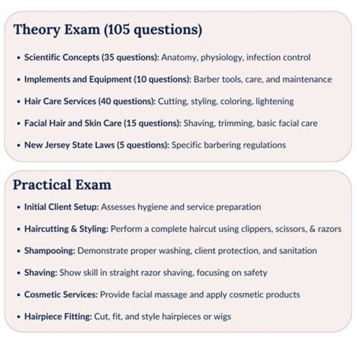 The barbering exam in California is in two parts: a written and practical component. The barber written examination has 100 questions and candidates are allowed 90 minutes to complete. The practical component may take up to 3 hours, with a scheduled 15-minute break period.