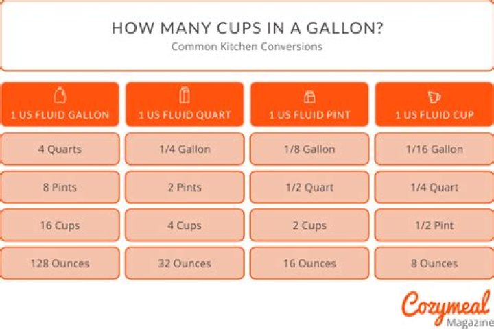 1 gallon = 128 ounces1/4 cup = 2 ounces1 cup = 8 ounces2 pints = 1 quart1/2 cup = 4 ounces4 quarts = 1 gallon