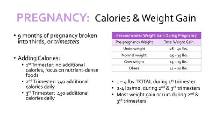 If before pregnancy, you were…You should gain…Underweight BMI less than 18.528-40 poundsNormal Weight BMI 18.5-24.925-35 poundsOverweight BMI 25.0-29.915-25 poundsObese BMI greater than or equal to 30.011- 20 pounds