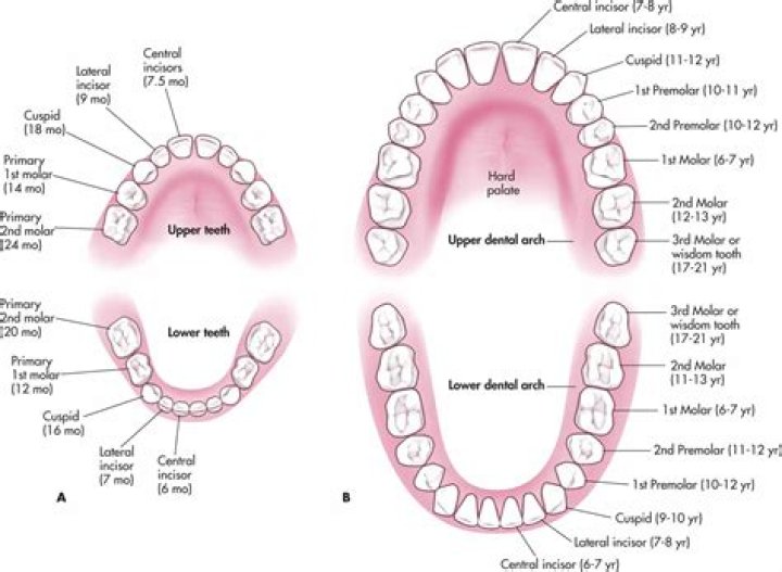 While most children have 20 primary teeth—10 in each of the upper and lower jaws—these teeth eventually are replaced by 32 permanent teeth, 16 in each jaw. The first permanent molars usually erupt between ages 6 and 7 years.
