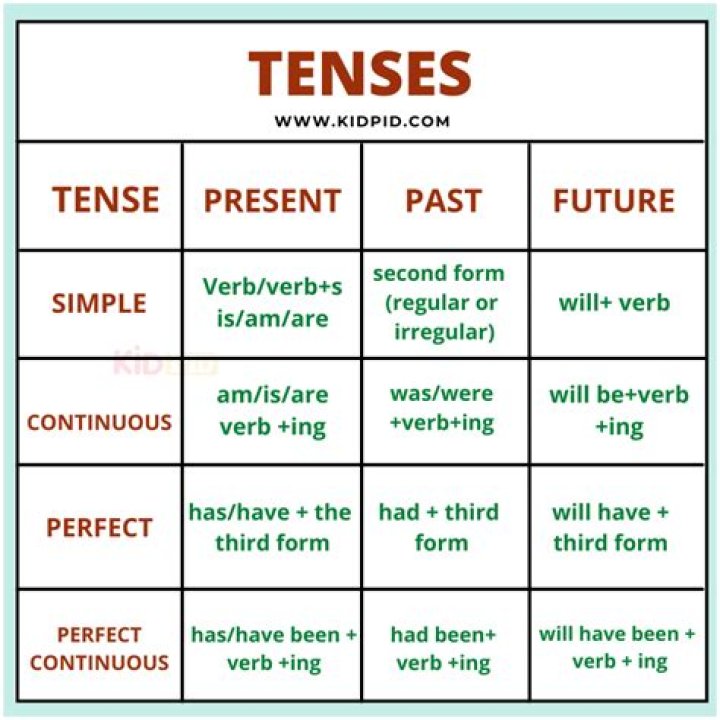 Verb TenseFormulaPresent SimpleSubject + Verb (v1) + s/esPast SimpleSubject + Verb (v2) or irregular verbFuture SimpleSubject + will/shall + verb (v1)Present ContinuousSubject + is/am/are + Verb(+ing)