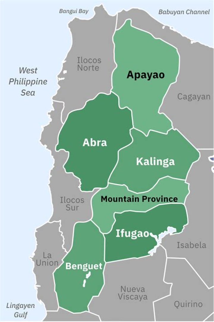 The region comprises six provinces: Abra, Apayao, Benguet, Ifugao, Kalinga and Mountain Province. The regional center is the highly urbanized city of Baguio.