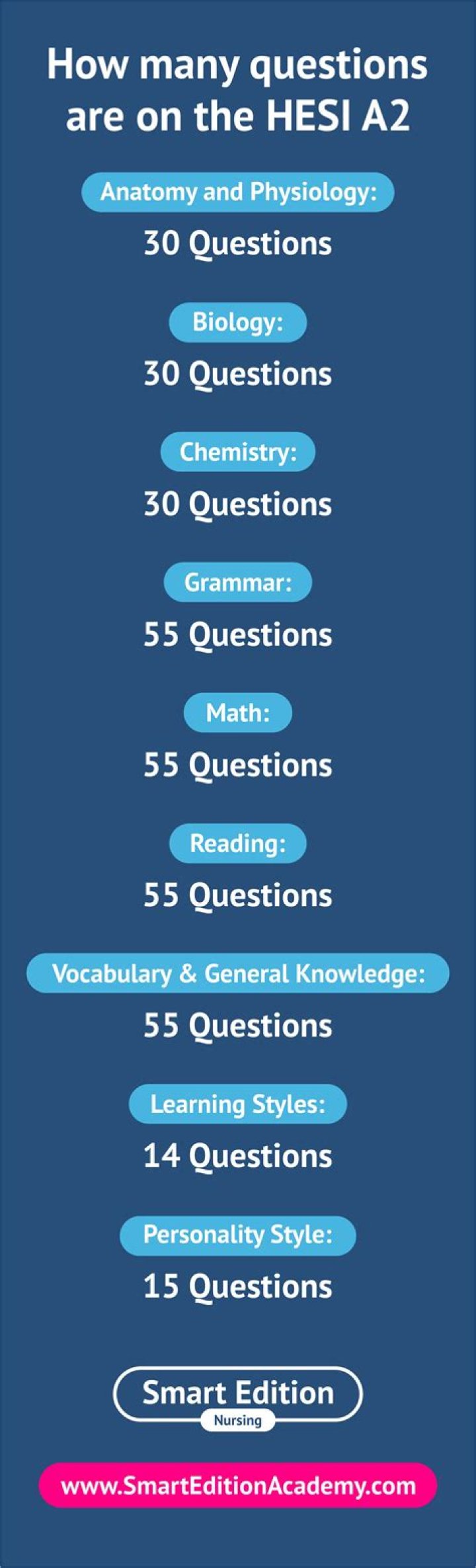 Each section of the HESI A2 contains 25-50 questions. All science sections contain 25 questions, while all math and English sections contain 50 questions. The one exception is Reading Comprehension, which contains 47 questions.