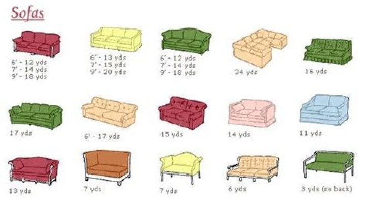 Upholstered Furniture2 Cushion Loveseat: 13 yards4 Cushion Loveseat: 17 yards2 Cushion Sofa: 16 yards3 Cushion Sofa: 18 yards6 Cushion Sofa: 22 yardsOttoman: 3.5 yardsSlipper Chair: 14 yardsWing Chair: 10 yards