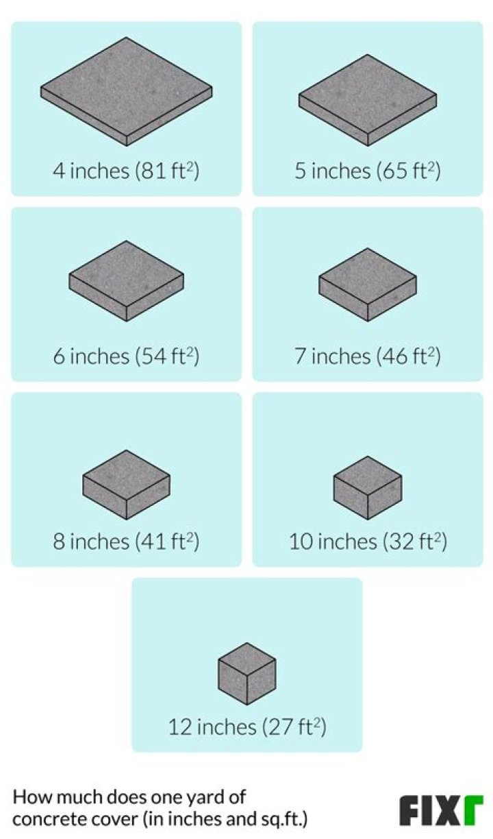 One Cubic Yard of Concrete: 4-inches thick – covers 81 square feet.