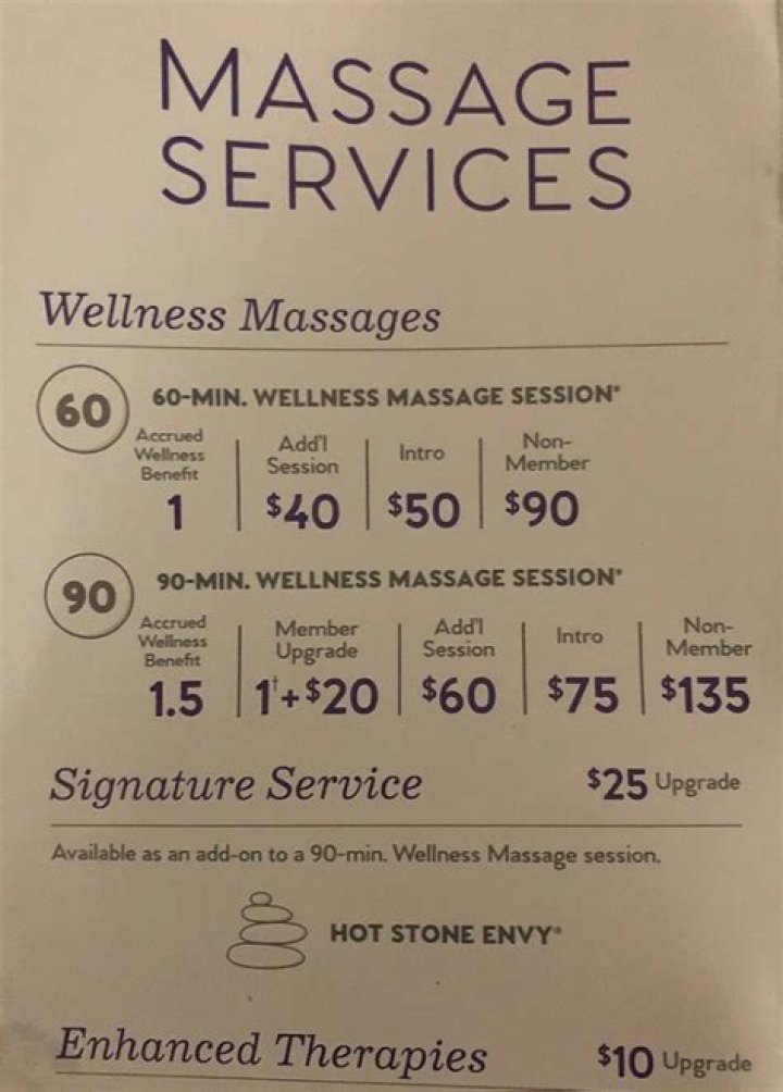 ServicePriceMassage (for Members)60-Minute Wellness Massage$49.9990-Minute Wellness Massage$74.99120-Minute Wellness Massage$99.99