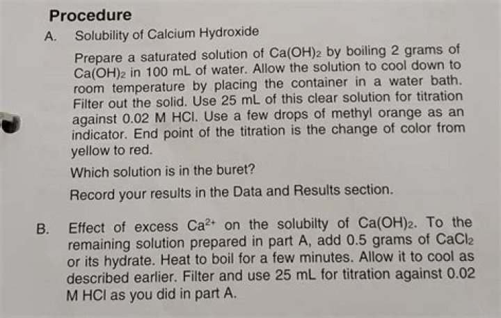 Create a saturated solution of calcium hydroxide by adding 0.10-0.30g of Ca(OH)2 to 30 mL of distilled water in a 50 mL beaker. You should see some undissolved calcium hydroxide at the bottom of the beaker. If not, add a little more calcium hydroxide.