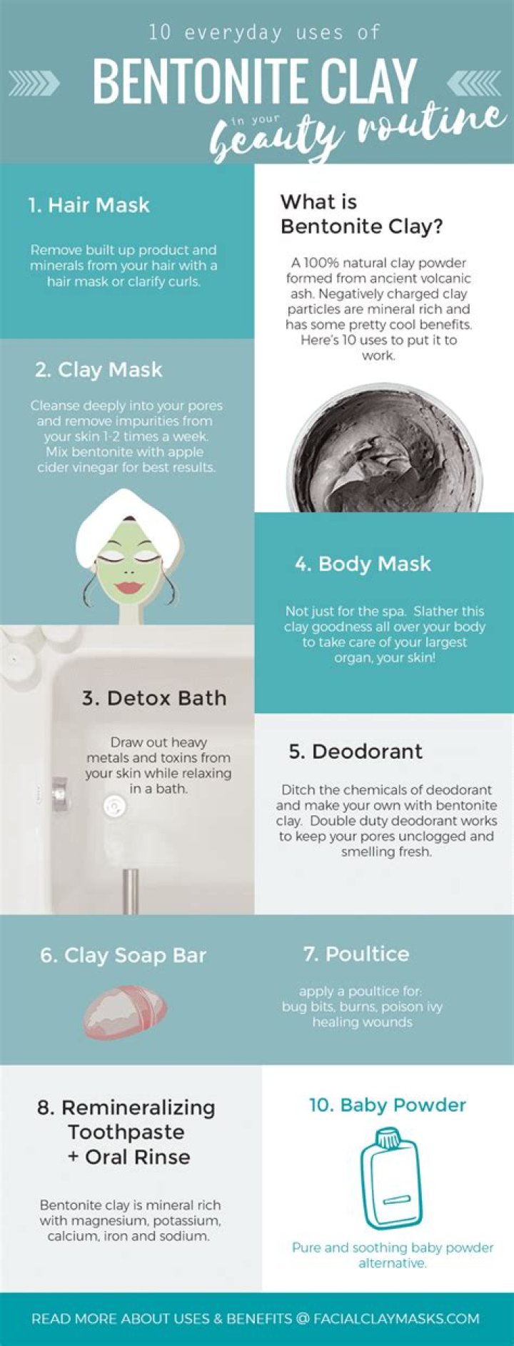 People have used bentonite clay to remove impurities on the skin, such as oils, and toxins from the body for thousands of years. Bentonite clay is present in many skin products, but some people also add it to foods or drinks with the aim of r