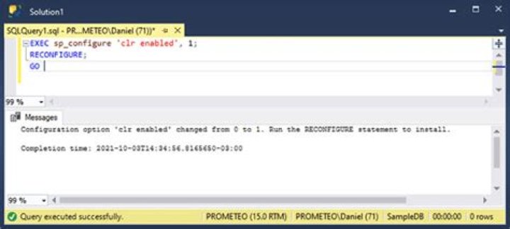 - Type the following: sp_configure @configname=clr_enabled @configvalue=1. GO. RECONFIGURE. GO.