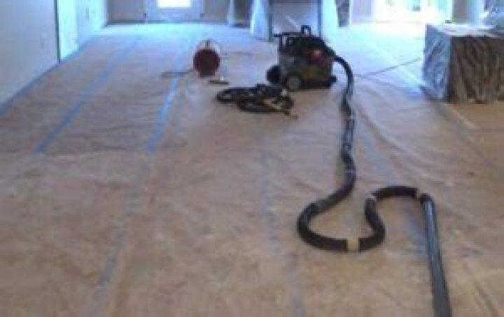 Hang a sheet of polyethylene plastic on either side of the entrance door frame. Use duct tape to seal the top portion of the plastic to the wall. Using these sheets on the door frames stops the spread of the drywall dust.