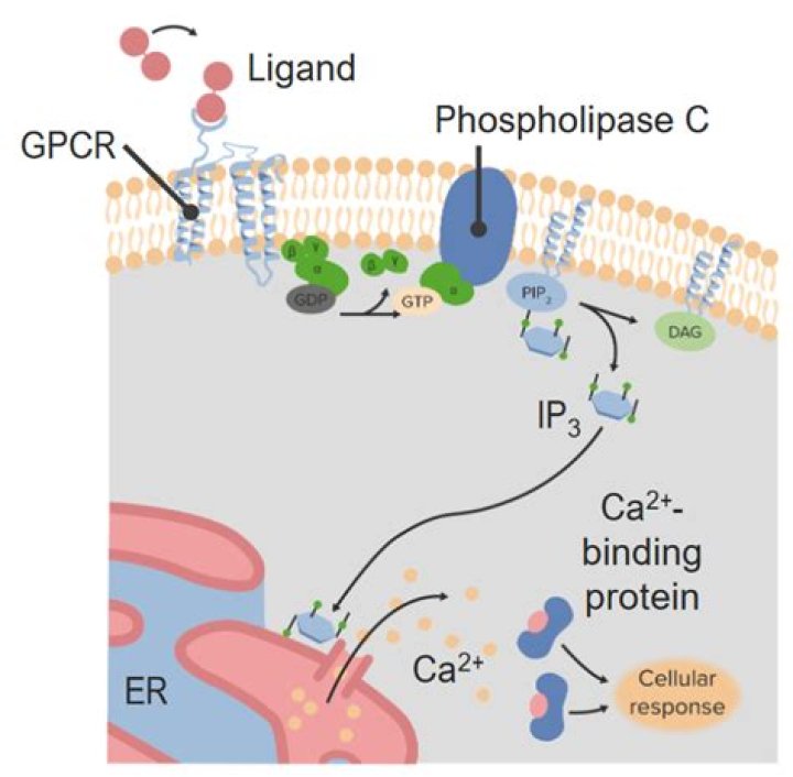 The phospholipase C β (PLC-β) family of enzymes is activated by heterotrimeric G-proteins. Activation of GPCR activates the Gαq family of G proteins and leads to the activation of PLC-β enzymes and the hydrolysis of phosphatidylinositol-4,5-bisphosphate (PIP2) on the cell membrane.